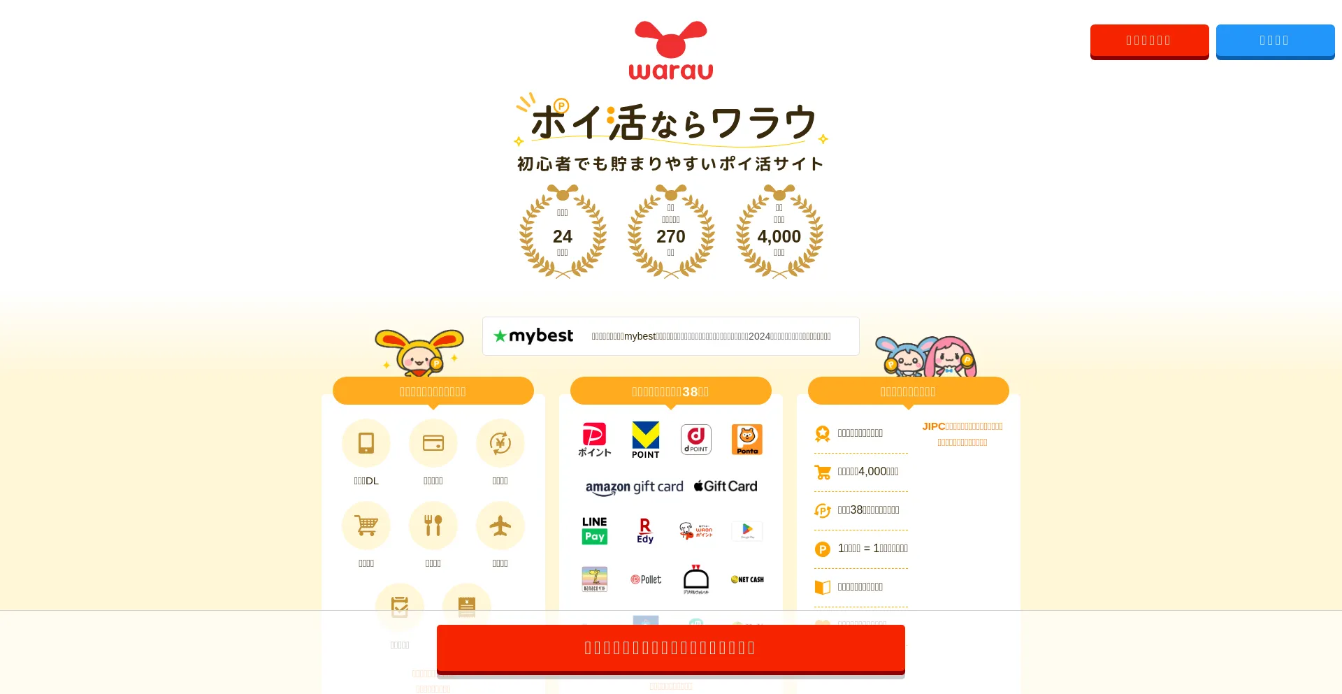 mybest「ポイントサイトのおすすめ人気ランキング」で1位に選ばれました。ワラウは初心者でも貯まりやすいポイントサイト!ポイ活ならワラウで毎日の暮らしをもっとおトクに。1ポイント=1円で分かりやすく、最低交換金額500円から即時交換可能で使いやすい。ウエル活、ポン活、陸マイラーにおすすめ。運営実績24年、登録数270万人、プライバシーマーク取得、JIPC加盟で安心・安全なポイントサイトです。